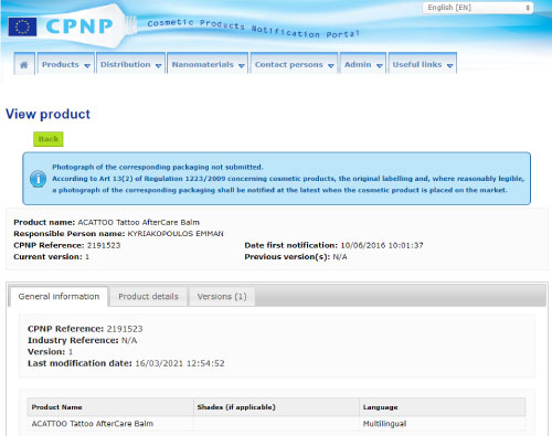 Δεν υπήρχε επίκαιρη καταχώρηση του προϊόντος στην ευρωπαϊκή βάση δεδομένων CPNP