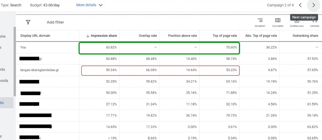 Στην παρακάτω εικόνα βλέπουμε πως η δική μας διαφήμιση εμφανίζεται στο πάνω μέρος της οθόνης στο 70% των περιπτώσεων, ενώ η διαφήμιση της langas-skarogiannislaw εμφανίστηκε λιγότερο, 53,23%